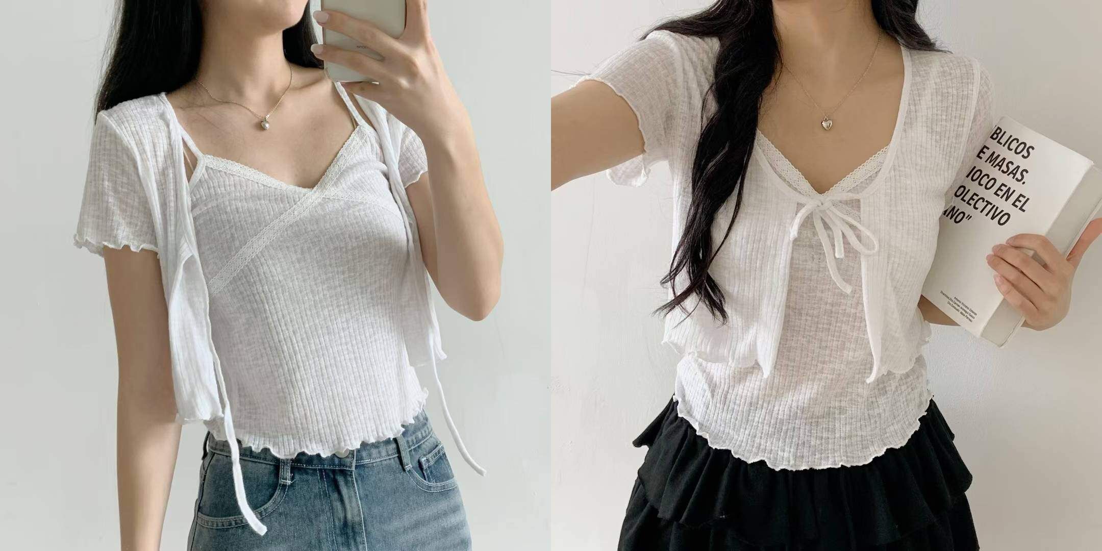 · 隱約透膚氛圍的V領針織衫 + 內搭背心套裝